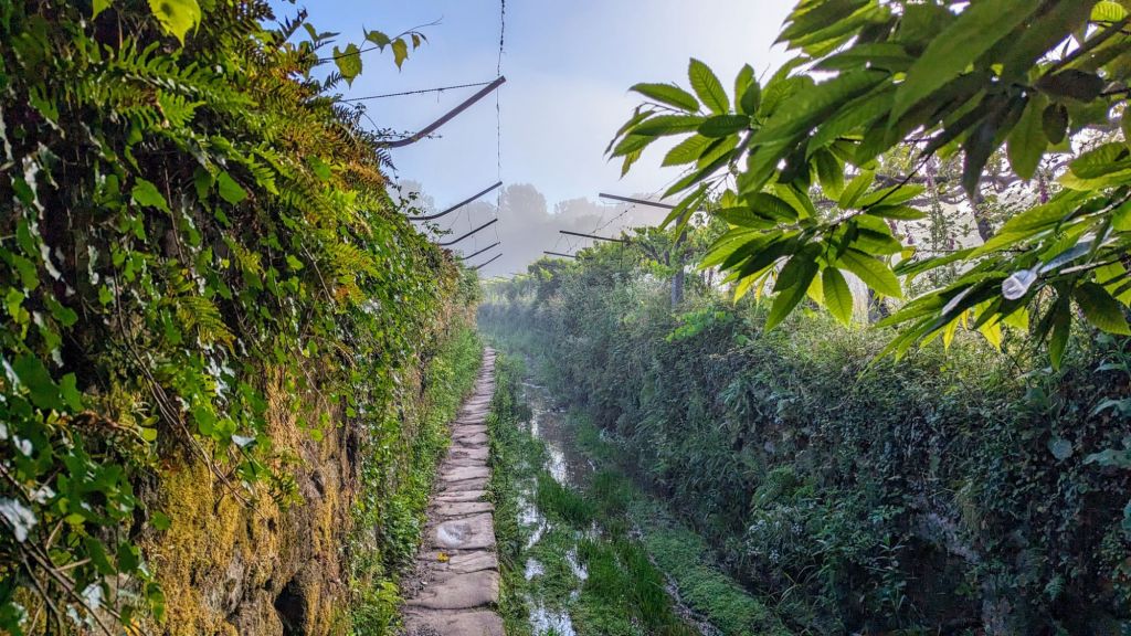 Aujourd’hui le tracé est vraiment magnifique, comme je les aime. Il fait gris et malheureusement il pleut. Je m’arrête pour mettre le poncho. Une majorité du tracé se déroule sur des pavés irréguliers entre lesquels mes bâtons se coincent souvent. Je ne peux pas les utiliser, au risque de les casser, mais je sens leur manque.