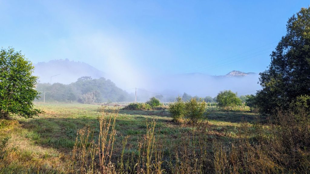 Ce matin je sens la fatigue de tous ces jours de marche, tous ces kilomètres parcourus. Il est 10 heures, je suis au kilomètre 13 quand le soleil déchire la brume et je peux enlever mon k-way.