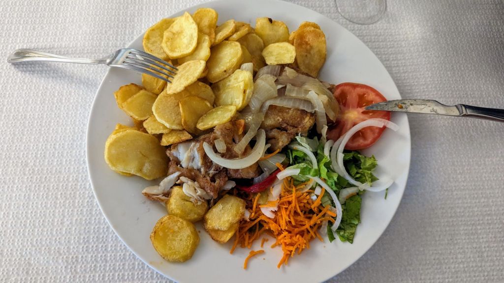 Hier soir nous sommes allés manger avec Renato et Patrick, un Français que j’ai déjà croisé deux ou trois fois. Comme c’était mon dernier jour au Portugal, j’en ai profité pour prendre un bacalao, de la morue : excellent !