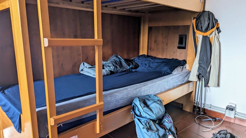 A 15h40 j’arrive au refuge du pèlerin. Je suis détruit, j’ai mal partout, au dos, à la hanche et à la nuque (saleté d’arthrose). Mais je suis très heureux car il y a de la place et ça va me couter 5 €. Par contre il n’y a ni draps, ni linge, ni couverture. Moi qui ai eu froid ces dernières nuits avec des couvertures, ça s’annonce difficile. Je n’ai qu’un sac à viande alors je dormirai habillé. Pour rajouter à mon épreuve, un jeune couple entre avec un bébé de 8 mois. Et où va dormir ce petit ange ? Bingo ! Dans le lit d’à côté.