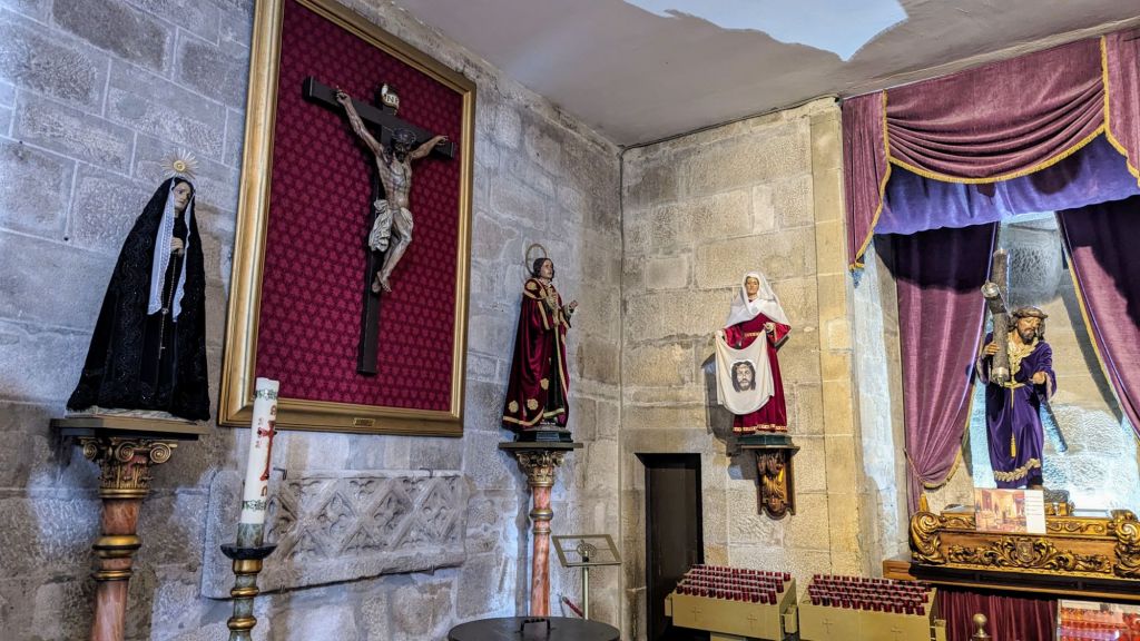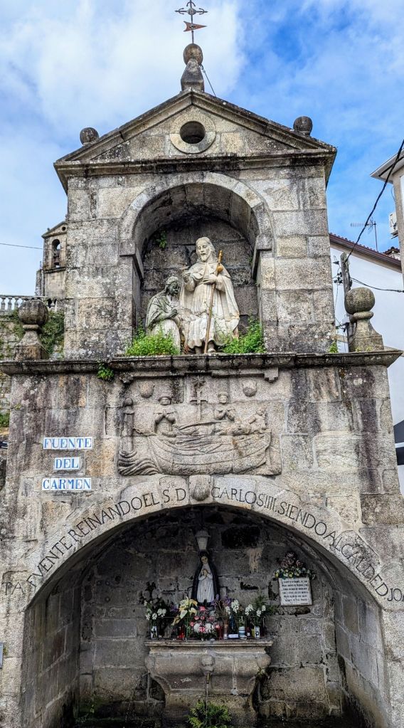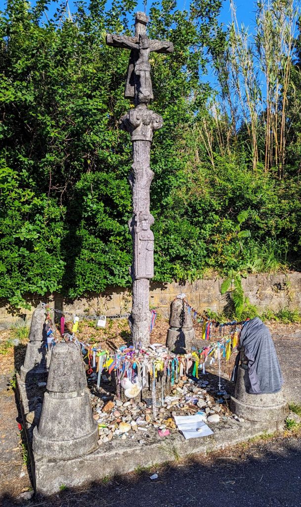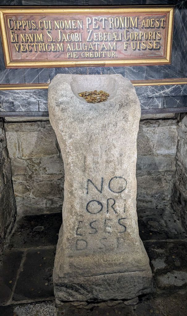 J’arrive à Padrón à 12h40 et j’y retrouve mon ami Renato. Selon la légende, Padrón est le lieu où accosta la barque qui transportait les restes de l’apôtre Jacques. En effet, après la décapitation de saint Jacques en 42 ap. J.-C., deux de ses disciples auraient transporté son corps sur une barque, traversé la Méditerranée, longé les côtes atlantiques de l’Espagne et remonté la rivière Sar. La barque aurait alors été arrimée au pedrón, pierre cylindrique que l’on peut voir dans l’église Santiago et qui a donné son nom actuel à la ville.