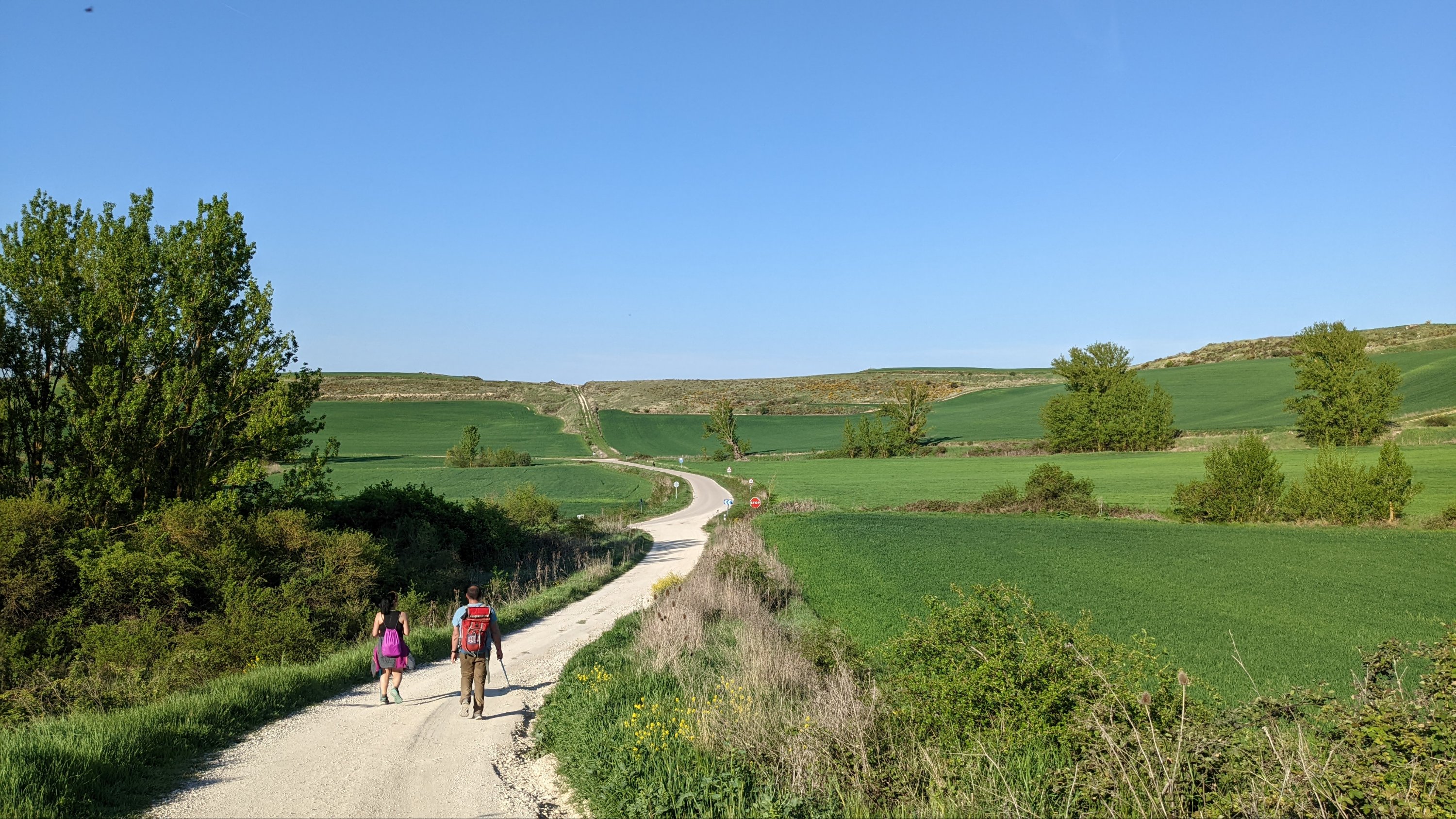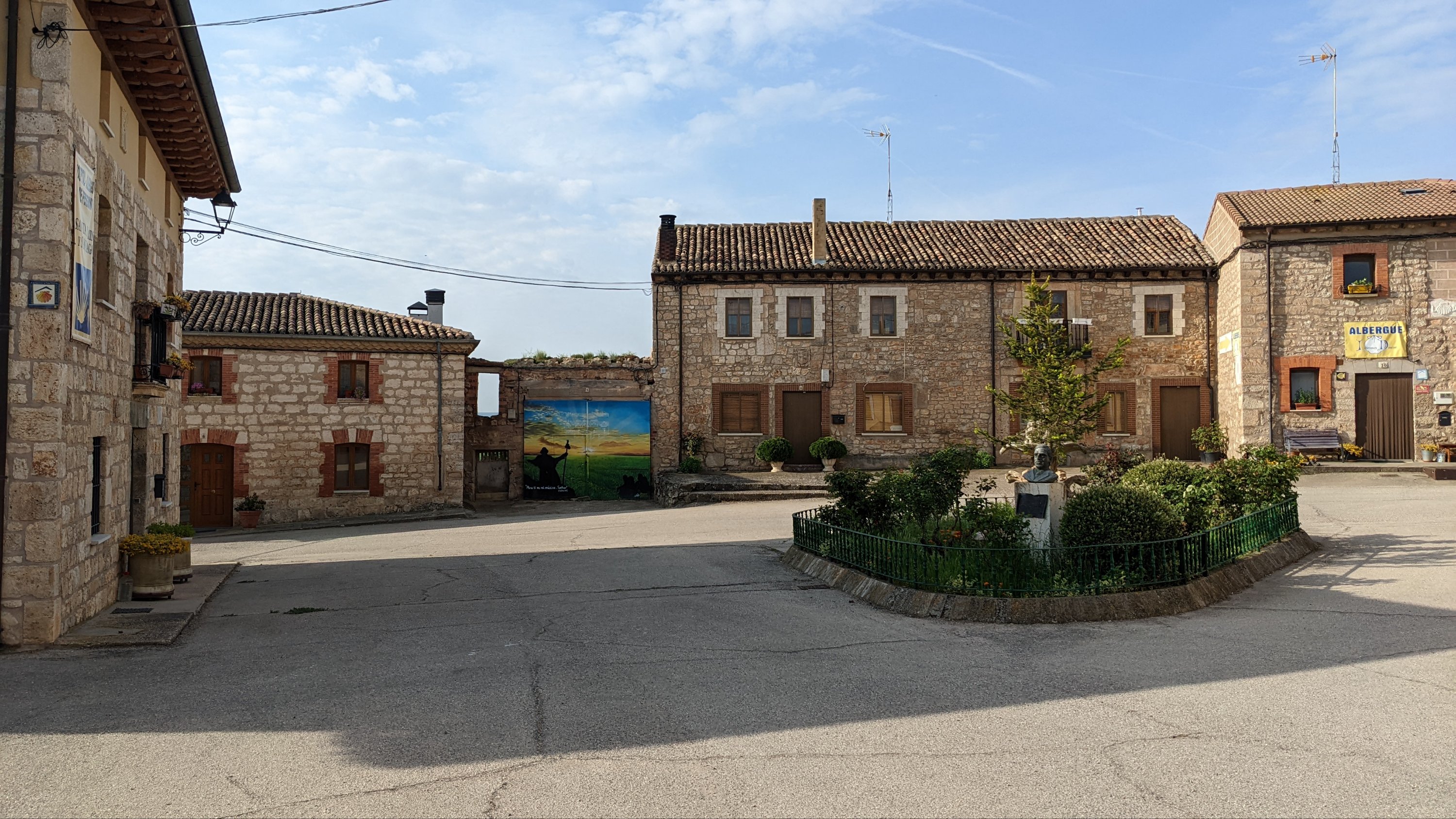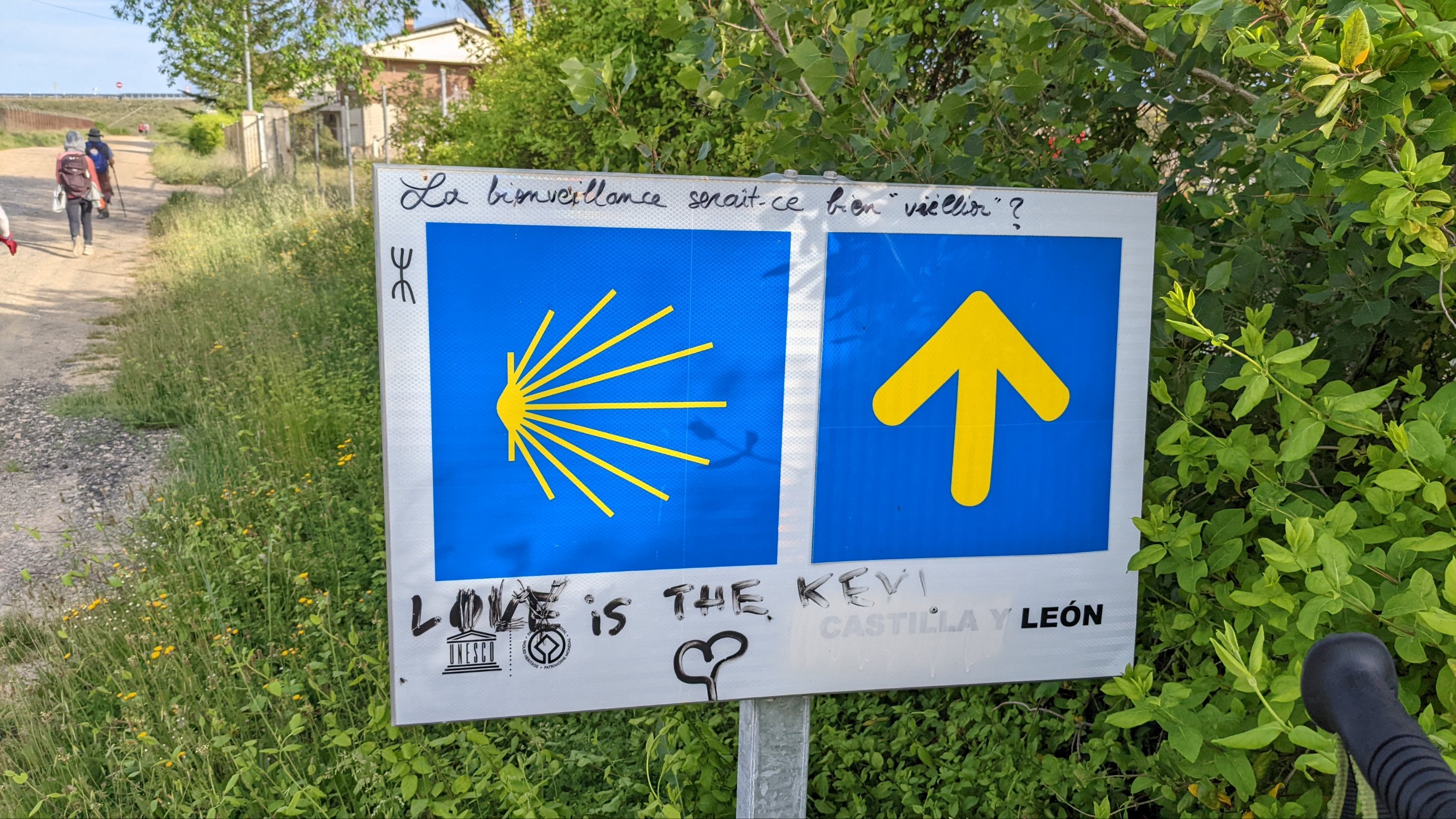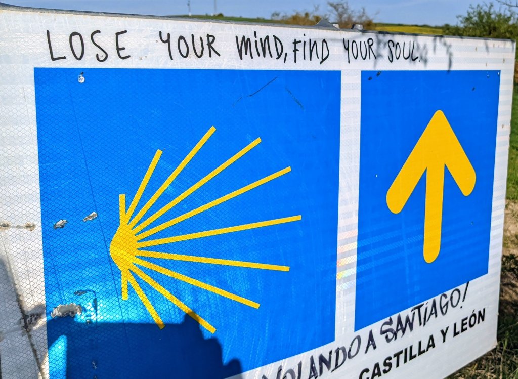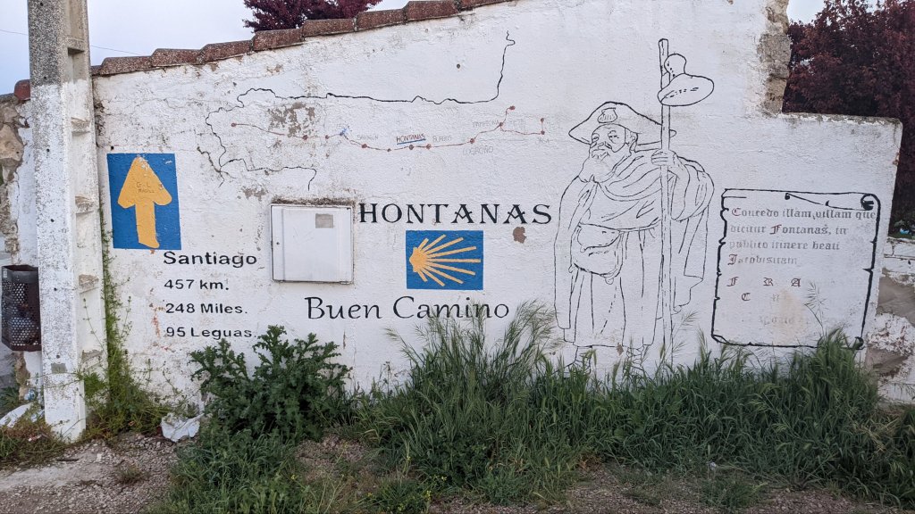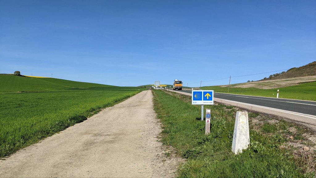 J’ai loupé le bar à l’entrée de Castrojeriz et il me faudra marcher près de 17km pour trouver un donativo tenu par un jeune couple qui vend quelques fruits, des biscuits et sert du café. Là je rencontre Sophia (nom d’emprunt mais pas pour des motifs de privacité, pour cause d’Alzheimer: j’ai oublié son nom 20 minutes après l’avoir quittée), une Slovène avec qui je fais un bout de chemin. Dans la discussion elle a mis en mots ce que je ressens: sur le Camino je suis heureux. Ça semble débile mais je ressens de la joie, je suis en paix, je me sens très privilégié de vivre ce pèlerinage hors du temps et dans un paysage d’une richesse, d’une histoire et d’une beauté exceptionnelles.