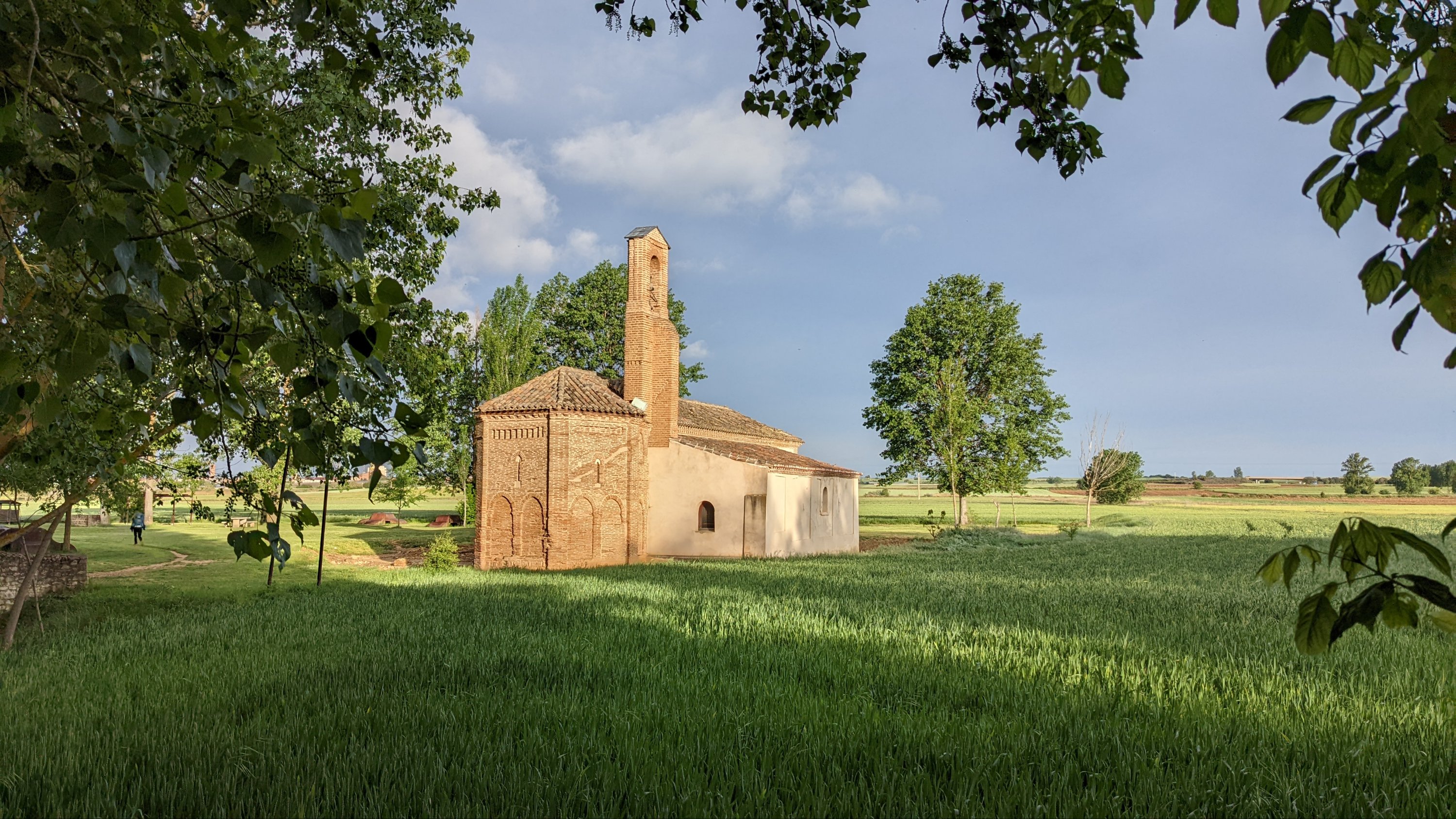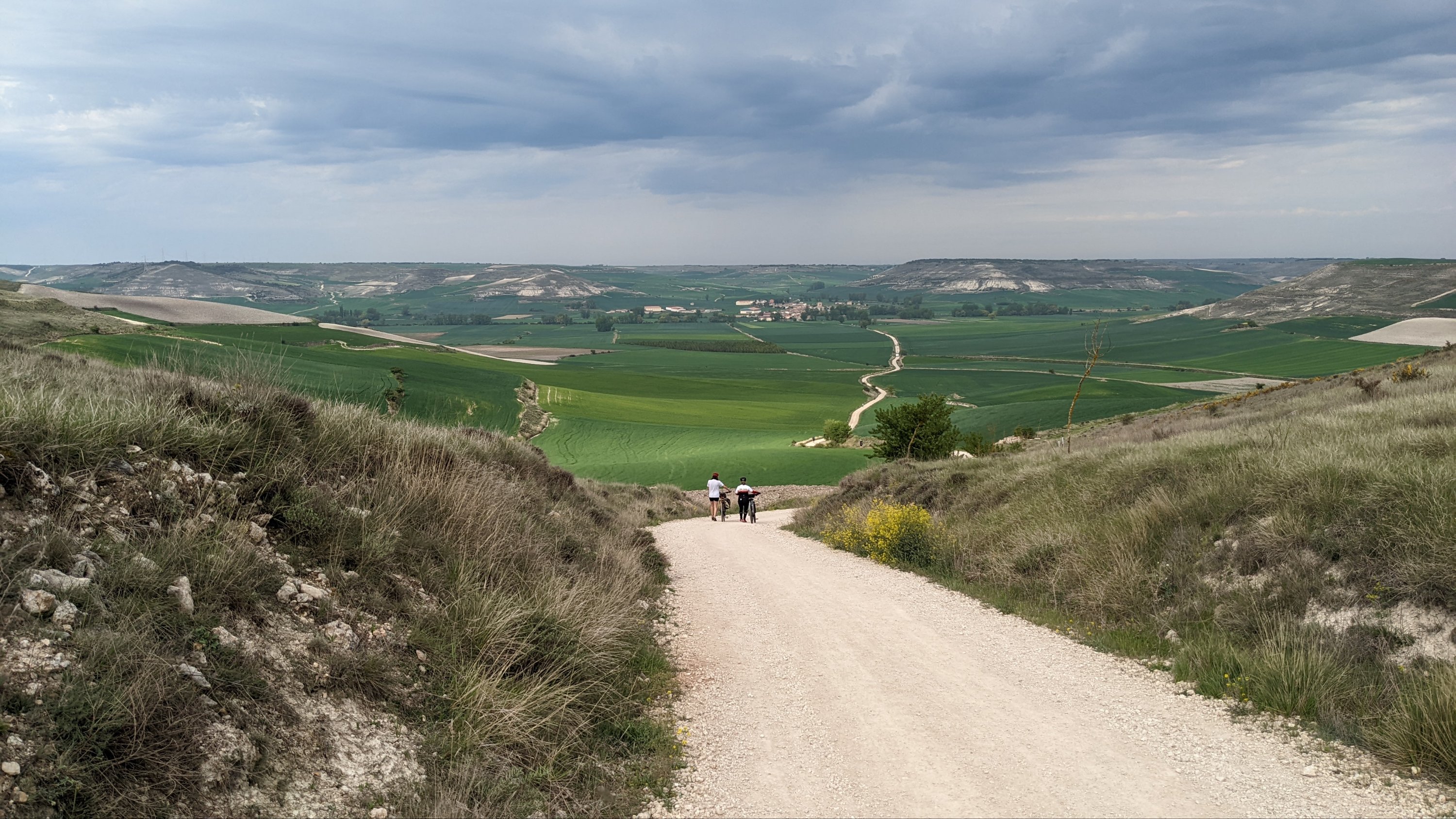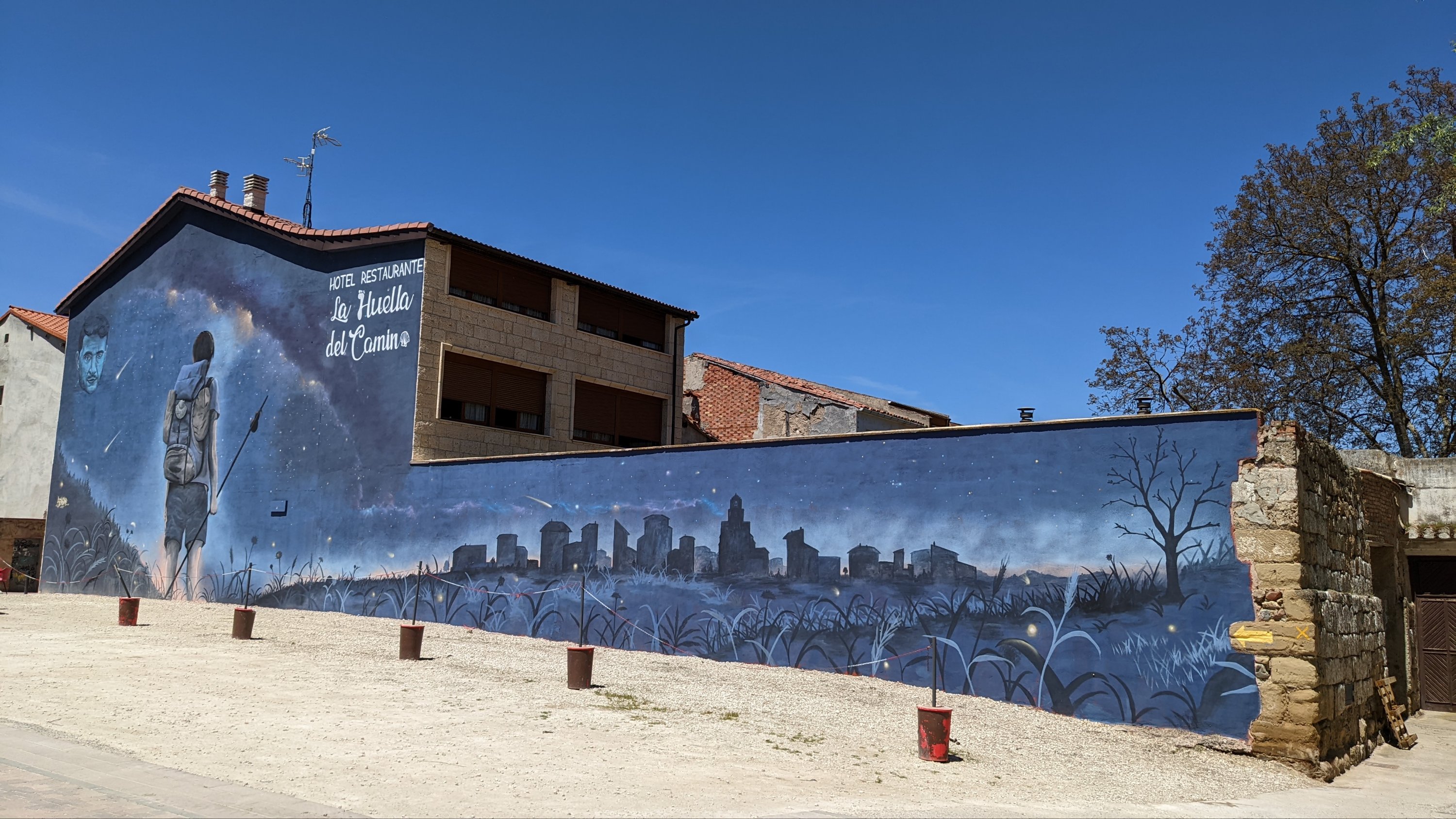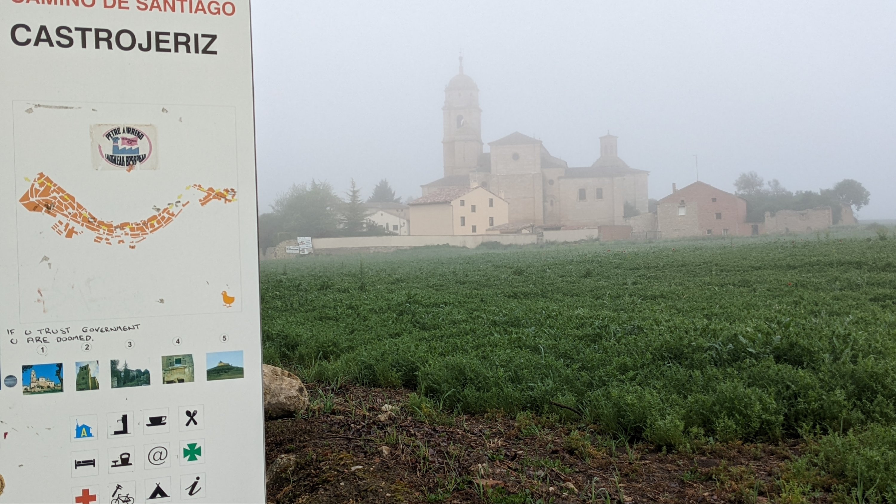 J’ai loupé le bar à l’entrée de Castrojeriz et il me faudra marcher près de 17km pour trouver un donativo tenu par un jeune couple qui vend quelques fruits, des biscuits et sert du café. Là je rencontre Sophia (nom d’emprunt mais pas pour des motifs de privacité, pour cause d’Alzheimer: j’ai oublié son nom 20 minutes après l’avoir quittée), une Slovène avec qui je fais un bout de chemin. Dans la discussion elle a mis en mots ce que je ressens: sur le Camino je suis heureux. Ça semble débile mais je ressens de la joie, je suis en paix, je me sens très privilégié de vivre ce pèlerinage hors du temps et dans un paysage d’une richesse, d’une histoire et d’une beauté exceptionnelles.