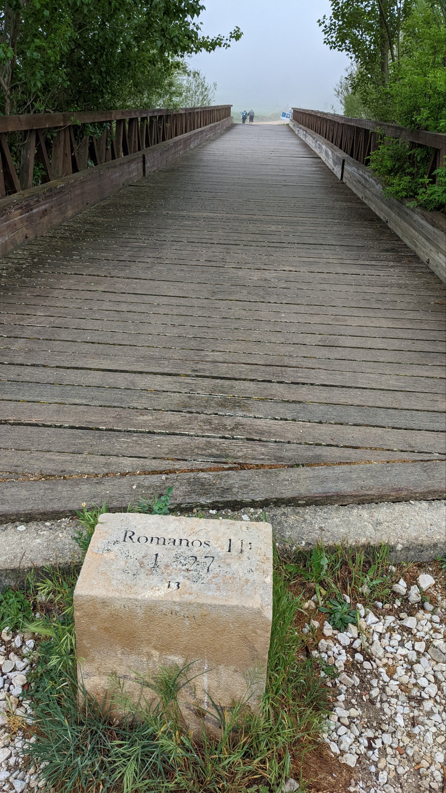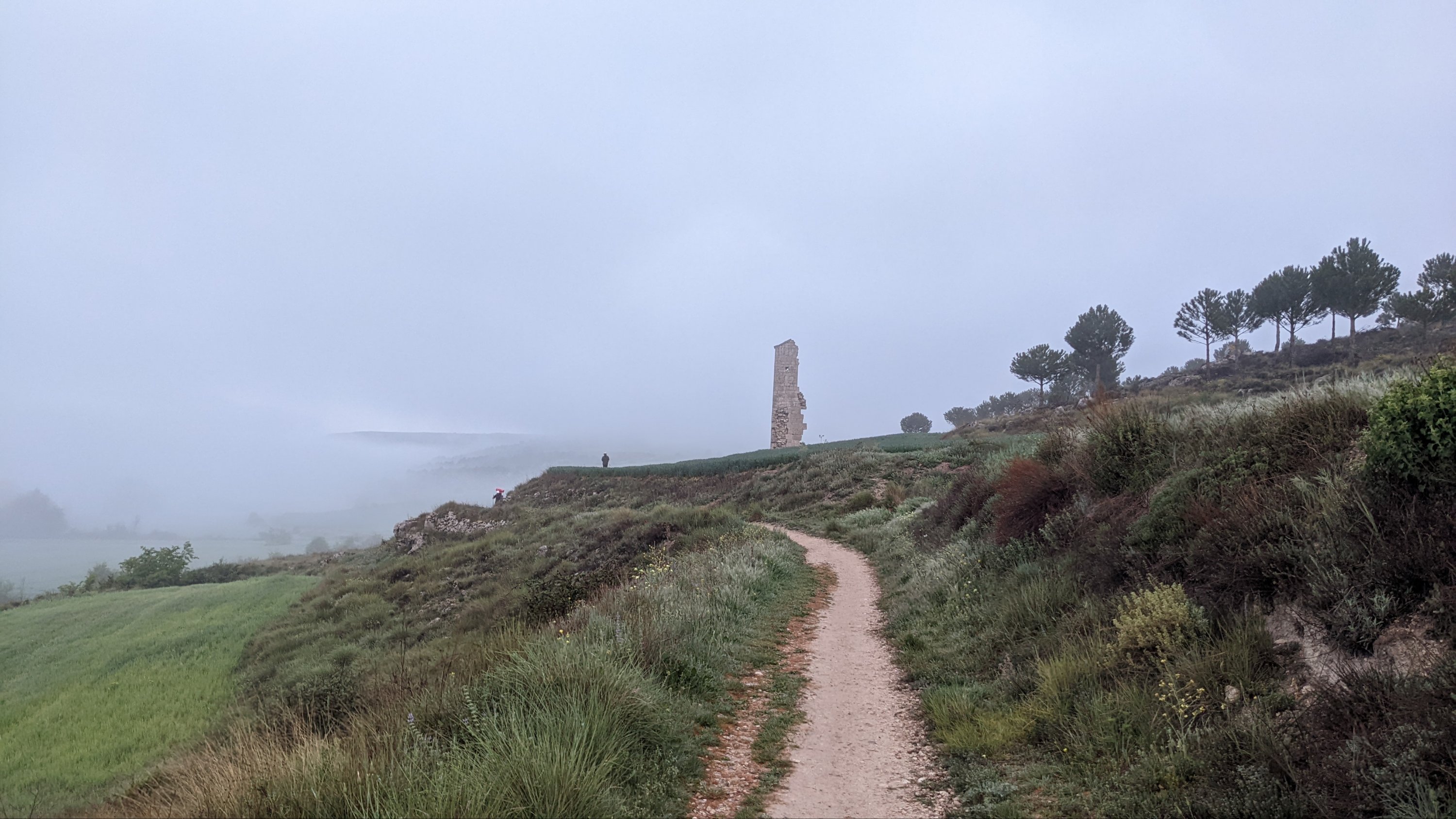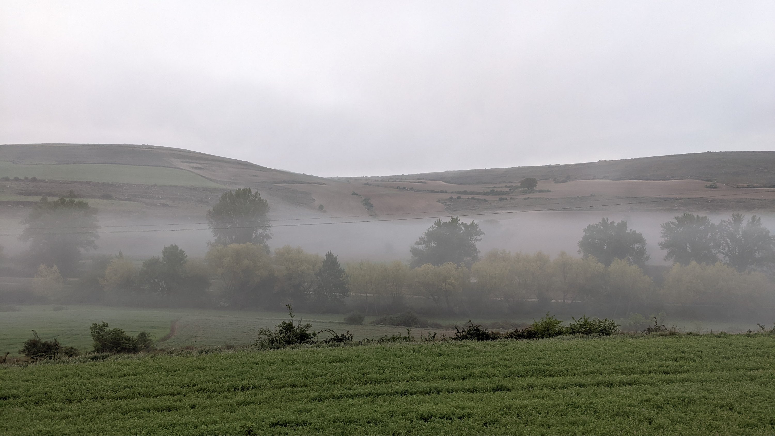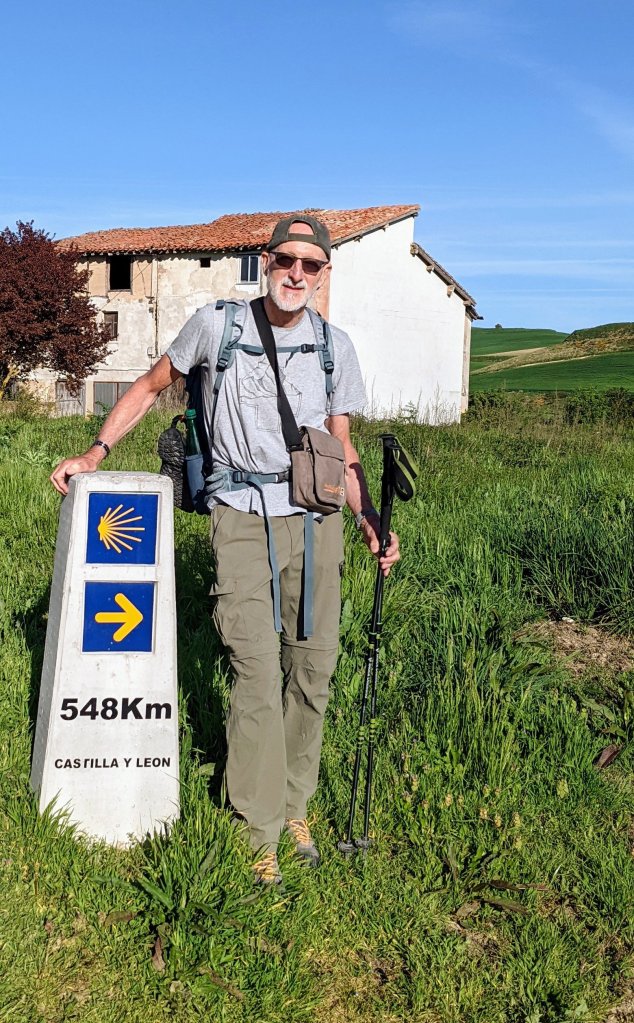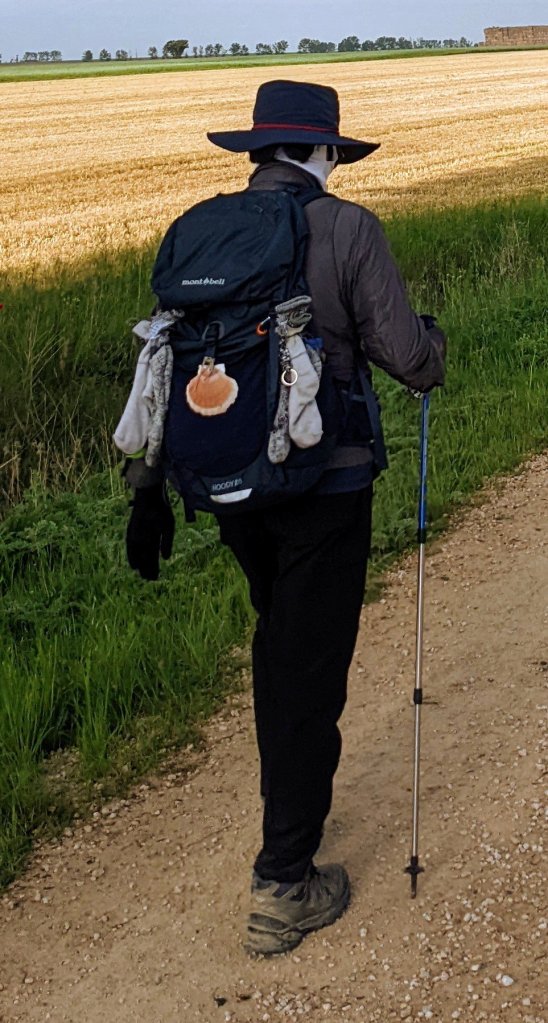 Grasse matinée, lever à 5h50 et départ à 6h50. Comme j’ai rallongé l’étape d’hier, j’ai dû changer les trois successives pour garder des kilométrages cohérents et ça m’enlève un jour sur le total. Très frais comme d’habitude le matin et de la brume dans la Meseta. Je marche seul entre 700 et 900 mètres. Mes compagnons Italiens sont partis plus tôt, nous nous verrons à l’étape.